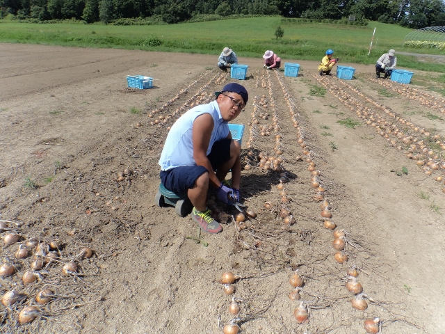 8月12日 野菜コースでは、たまねぎの収穫を行いました。 →8月12日は北早生3号 →8月28日はスーパー北もみじ 青いコンテナにたまねぎを入れすぎ、 持ち上げるのが大変でした。