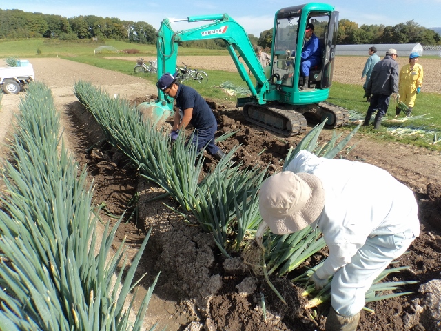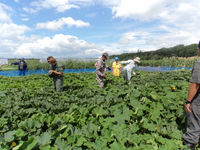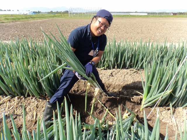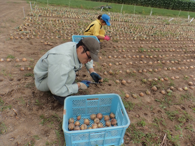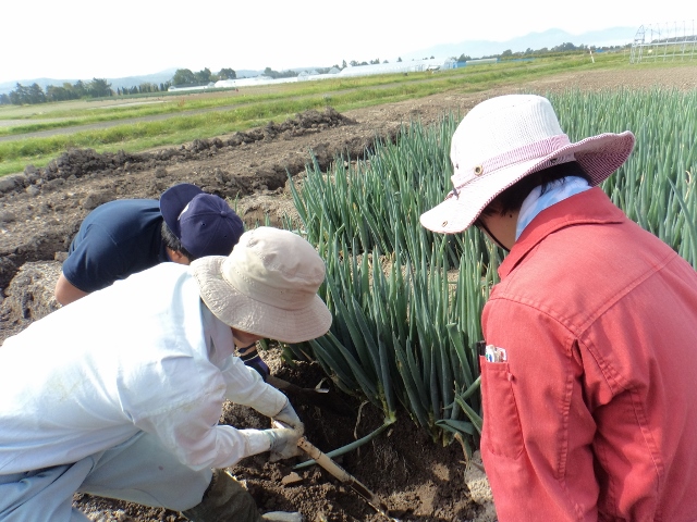 8月12日 野菜コースでは、たまねぎの収穫を行いました。 →8月12日は北早生3号 →8月28日はスーパー北もみじ 青いコンテナにたまねぎを入れすぎ、 持ち上げるのが大変でした。